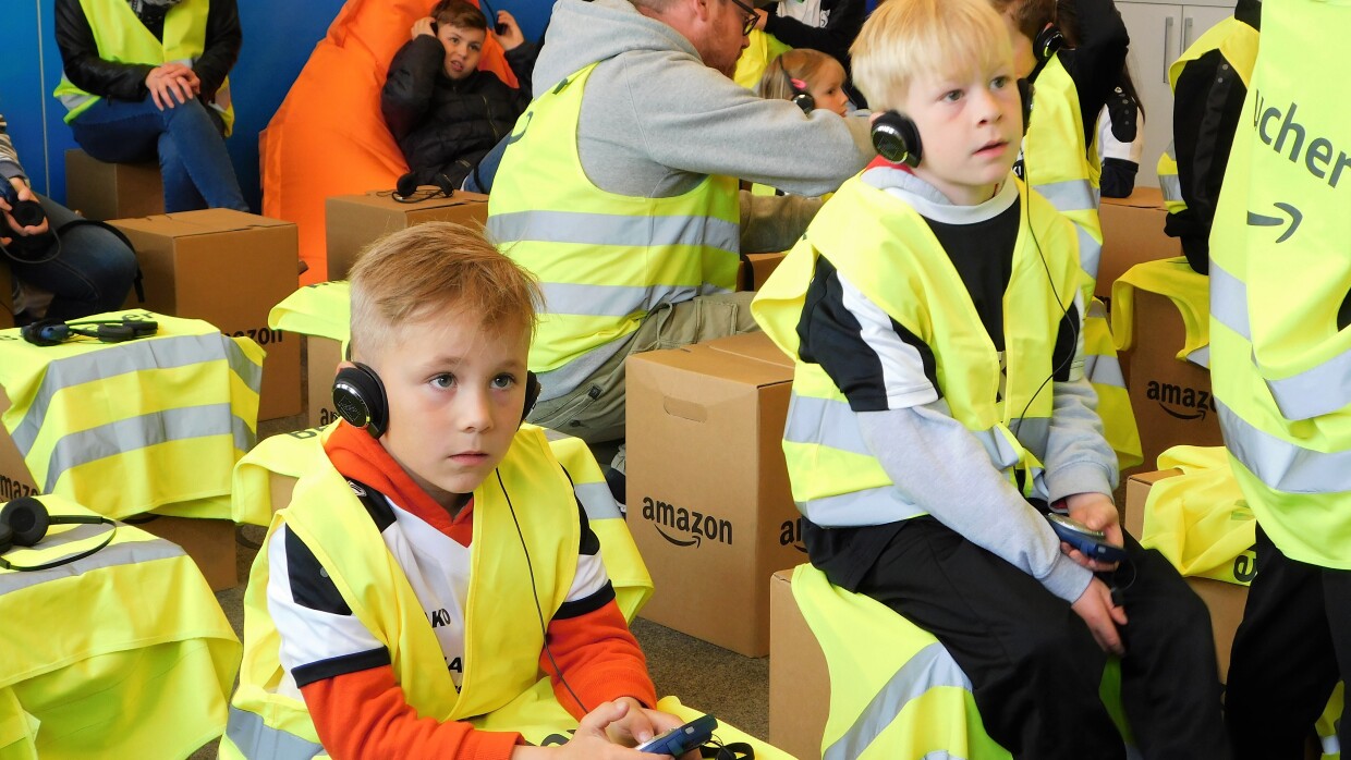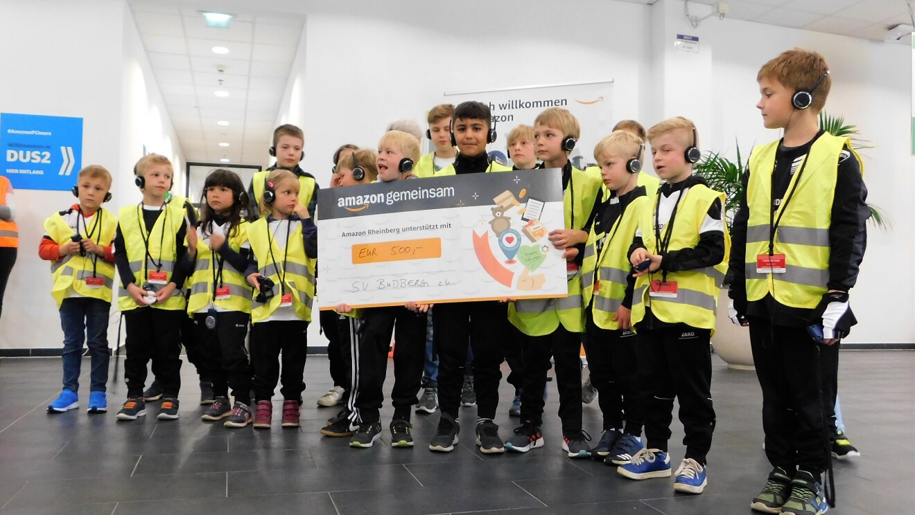 Während der Führung durch das Logistikzentrum gab es für die jungen Fußballer spannende Begegnungen mit zahlreichen Ligavereinen. Auf Borussia Dortmund und Schalke folgten Duisburg, Mönchengladbach, Bayer Leverkusen, Eintracht Frankfurt und schließlich der FC Bayern – zumindest bei den dortigen Packlinien für Kundenbestellungen. Bei Amazon in Rheinberg wurden sie nach Bundesligavereinen benannt.