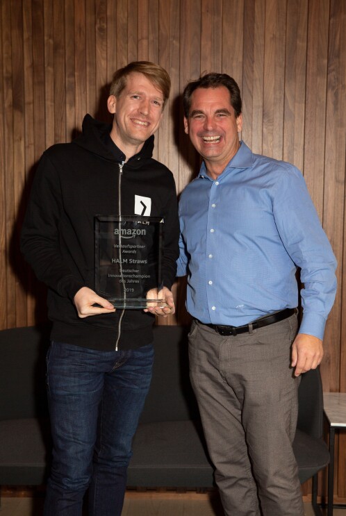 Nicholas Denissen (rechts), Amazon Vice President Small Business, überreichte den Preis als Innovation Champion des Jahres an Johannes Arning von HALM Straws.Foto von Suzi PrattDie Gewinner der Verkaufspartner Awards Johannes Kliesch und Felix Bauer von SNOCKS, Johannes Arning von HALM Straws sowie Dawood Shahid und Tobias Theil von InnovaMaxx sind für eine Woche nach Seattle ins Headquarter von Amazon gereist. Nachdem Amazon die Verkaufspartner Awards für kleine und mittlere Unternehmen (KMU) im vergangenen Jahr zum ersten Mal vergeben hat, haben sie sich dort mit den Gewinnerinnen und Gewinnern aus Großbritannien und den USA getroffen.